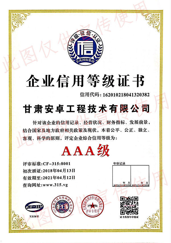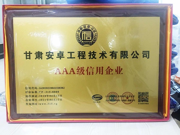 近日,我公司榮獲AAA級企業信用等級證書,標志甘肅安卓在履約能力、客戶信用、質量管理等綜合實力與競爭力再次獲得權威肯定。