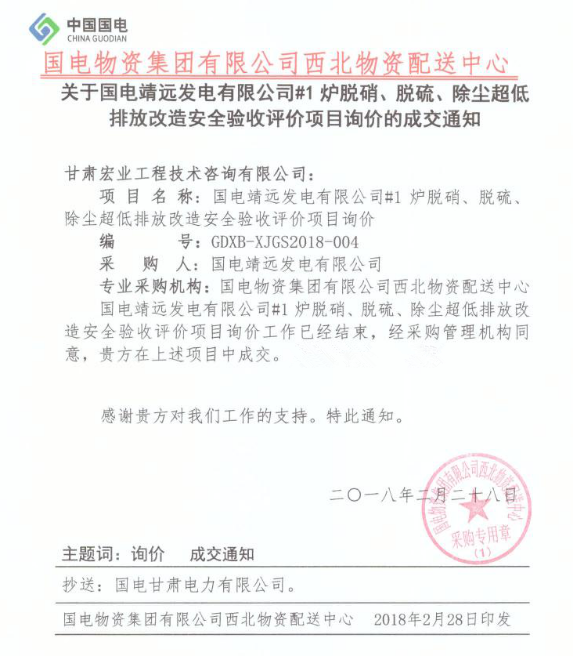 甘肅宏業工程技術咨詢有限公司中標國電靖遠發電有限公司#1爐脫硝、脫硫、除塵超低排放改造安全驗收評價